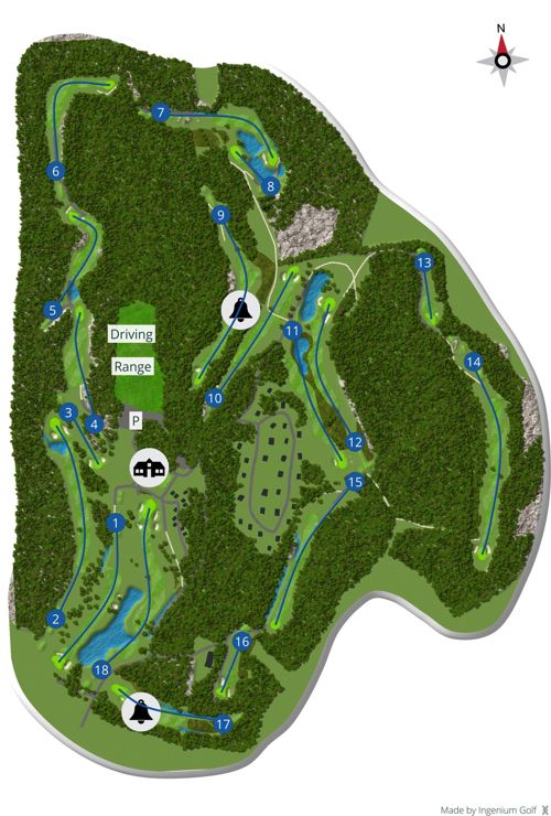 Etter lunsj går vi ut å spille 18 hull på banen. Banen består av 4 par 3 hull, 10 par 4 hull og 4 par 5 hull.